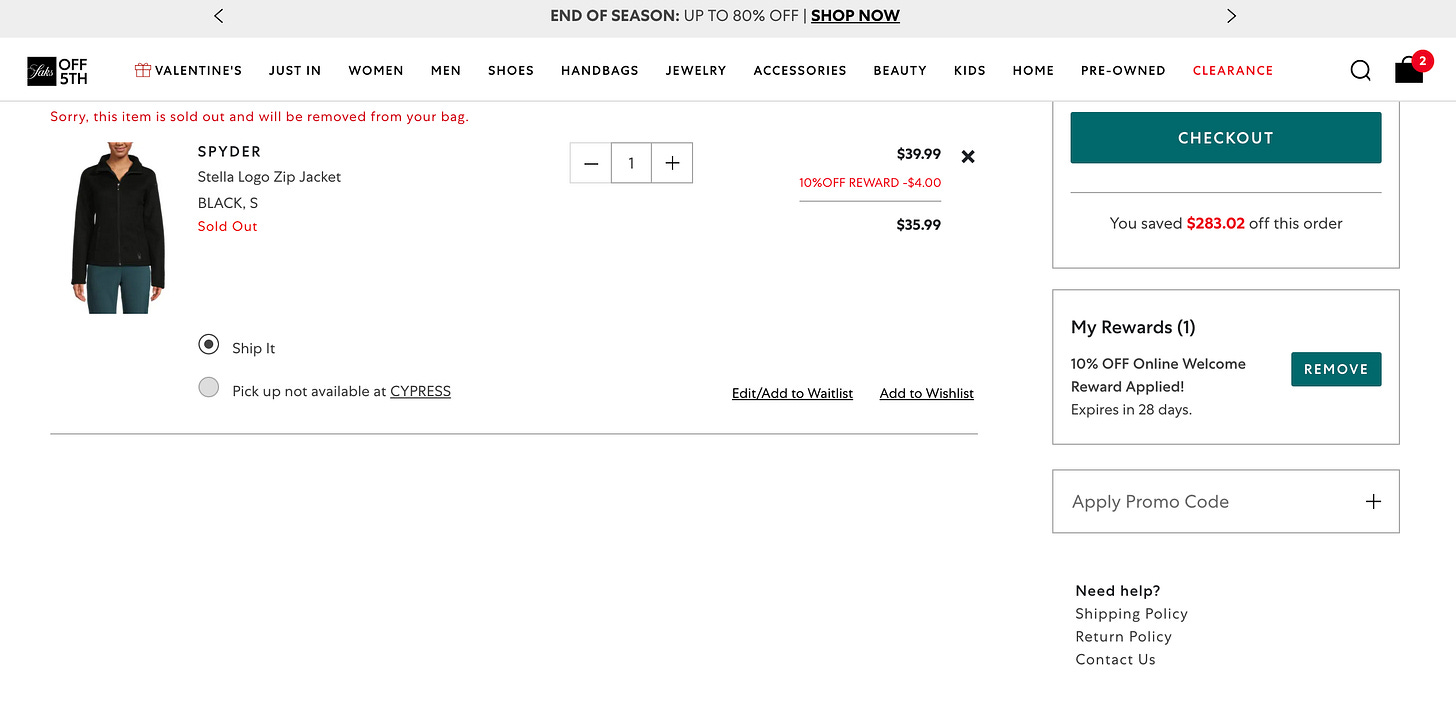 I’ll get into the details behind the Nordstrom Rack business model in a different article, but I very quickly found a similar Spyder jacket for women for $39.99 on Saks OFF 5TH.